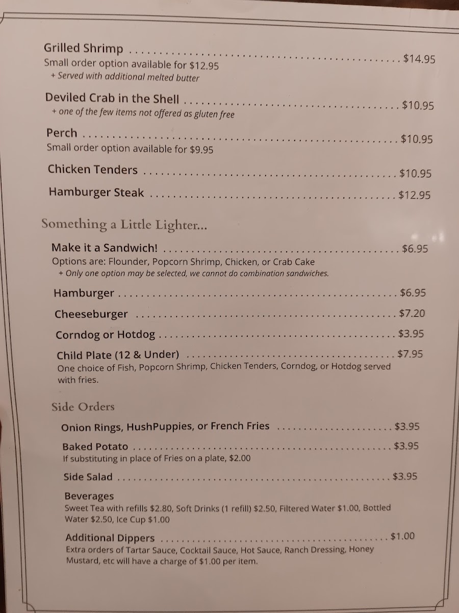 Alongside seafood, there are lighter options such as sandwiches and simple kid-friendly plates to suit a variety of appetites. Side orders like onion rings, baked potatoes, and fresh side salads round out the menu, inviting you to create a well-rounded meal that complements the easygoing setting.